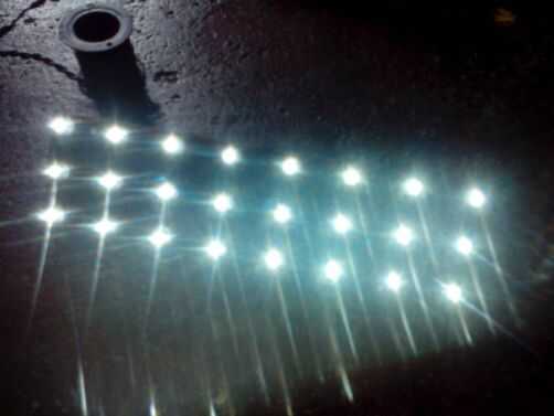 de salida de luz equivalente de una bombilla de halógeno de 70 Watts pero solamente uses12 vatios de potencia.Haz tiros muestran un edificio en la noche 100-ft distancia iluminada por esta luz LED bicicleta.Detalladas especificaciones y lista de piez