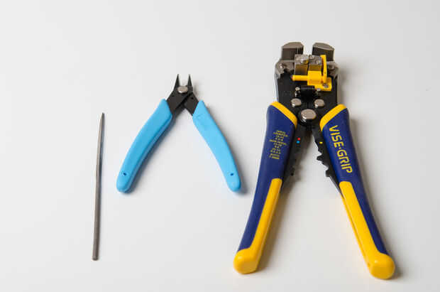 - Peladores de alambre. Yo uso de esos: herramientas industriales de Irwin 2078300 8 pulgadas de ajuste automático para pelador con asas ProTouch de cables Nota: la descripción dice que es buena a 24 AWG, pero funciona bien hasta 28 AWG trenzado.