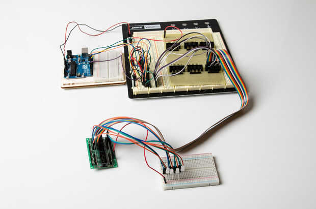 Mi imagen muestra sólo dos TLC5940, cables de una cinta y un nodo. Ud. va a necesitar hasta tres cables de cinta y dos nodos si usted alambre todo hasta como tengo. También será un nido de ratas de cables como se muestra en la siguiente imagen. Blech! Pero que puede ocurrir cuando se utilizan cables, cabeceras y breadboards para conectar todo.