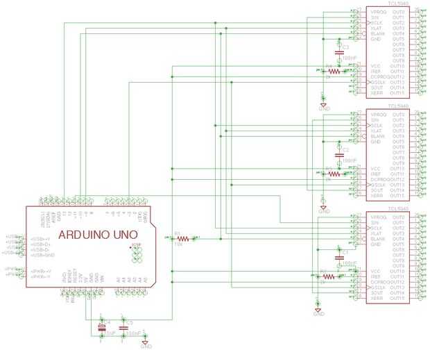 y echar un vistazo en el diagrama. Tenga en cuenta que utilizamos tres TLC5940s. El TLC5940 terceros vinculados en la misma forma que la primera a la segunda.