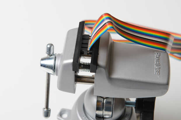 Los cables de listón pueden ser una brisa o una pesadilla. No sé que. Que había creado accidentalmente los cables cruzados y rectos. El cable de cinta es fácil. Un vicio es muy útil para el tipo de conectores (16 pines en 2 hileras) estoy usando. Usted simplemente desliza el alambre de la cinta en el conector, que tiene un montón de dientes o golpecitos del vampiro. Coloque el conector y la cinta de alambre en la prensa asegurándose de que el conector esté al ras con las mordazas. Simplemente apriete la mordaza. Usted sentirá los grifos de cortan en el cable de cinta y listo.