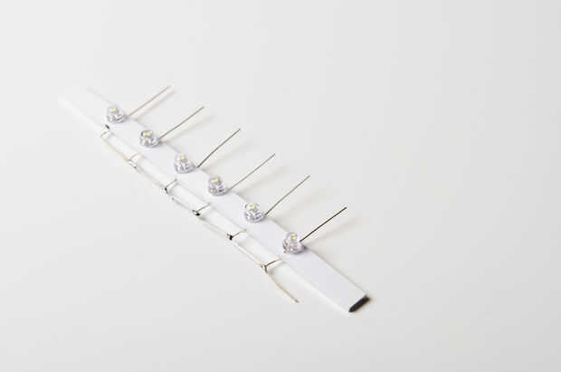 El LED más tiras son para la barra. Sólo corté un agujero en el cartón que era sólo lo suficientemente grande como para que los LEDs caber a través. Mi LED incluso no te caliente después de horas de continuo uso así que no estoy preocupado por un posible incendio. Conectar los LEDs y verificar que todo se ilumina y funciona correctamente. Los LEDs de esta tira se espacian para que puede soldar entre sí los ánodos en un solo autobús. Sólo necesita un cable de puente para conectar todos los LEDs al nodo.