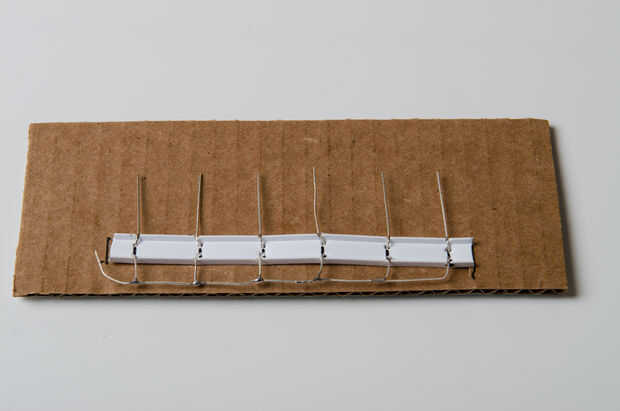 Tenemos que crear nuestra primera tira de LED para iluminar cuatro ventanas. Las luces que encender y apagar a intervalos aproximadamente regulares. Comenzar colocando una tira de canal a lo largo de las ventanas. Cortar la tira con unas buenas tijeras. Usuario un marcador permanente a donde deben ir el LED y un separador de ambientes.
