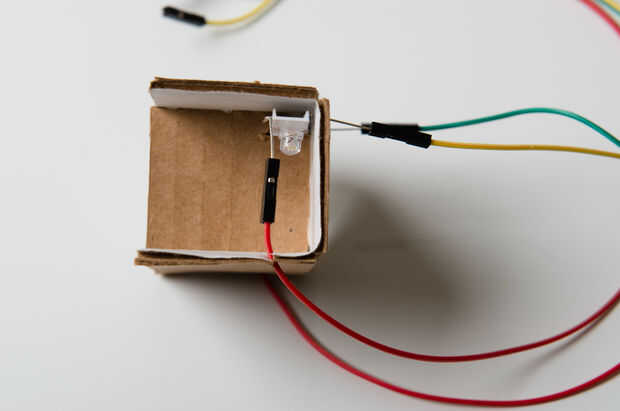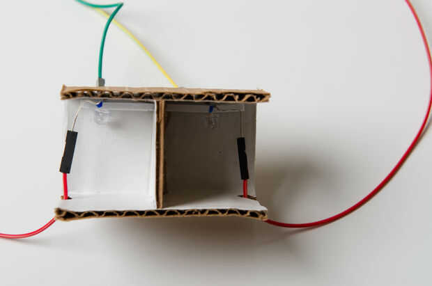Perforar cuatro agujeros en la parte superior de la caja para los 4 cátodos de LED ir a través. Usar algo muy pequeño y que las puntas será suficiente para pasar por qué cartón poco sigue siendo. Esto hará que un sello hermético muy ligero. Conecte los cables de puente, o algún tipo de presión o de la soldadura de alambre a los ánodos. Hacer dos finos cortes en la parte inferior de la caja y el cable a través del hilo de rosca. Cartulina hace muy fácil ya que puede ser forzado a enrollar el cable. También puede utilizar espuma o con cinta aislante para doblarse y cubrir los agujeros del alambre. Conectar los cables de cátodo demasiado.