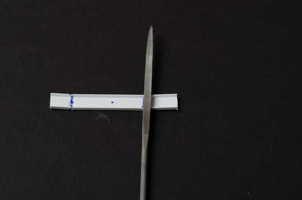 Tomar un clavo y martillo y utilizarlo para perforar dos agujeros aunque el canal para cada LED. Eliminar el exceso de plástico con un archivo, papel de lija, x-acto cuchillo o algo fuerte. Ahora uso un archivo o una herramienta similar para hacer muescas para el cátodo y el ánodo del LED. Marcar la muesca del ánodo (largo plomo).