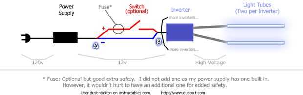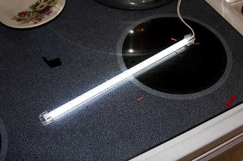 2. a menos que las luces van a estar muy juntas, se desea utilizar longitudes adicionales de cable para conectar a la fuente de alimentación para cada inversor. Me funcionó una sola línea de cable de 2 conductores aparato alrededor de la cocina y cortar periódicamente a empalme.
