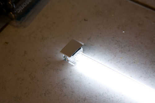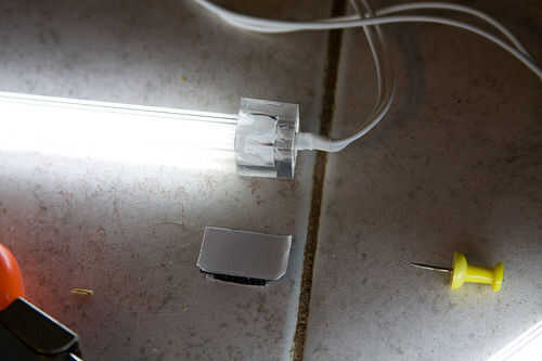 Los kits suelen ven con velcro con adhesivo. Dependiendo de la superficie por debajo de los gabinetes puede funcionar o fallar miserablemente. Por debajo de los gabinetes de mi mamá la madera es muy áspera para que el adhesivo no puede obtener una bodega muy buena. En superficies lisas el adhesivo del Velcro se pega excesivamente bien. Desprenda el papel protector de un lado del Velcro y pega a los extremos de la luz. Retire el papel protector del otro lado del Velcro y péguela debajo del gabinete, espaciado como se desee.