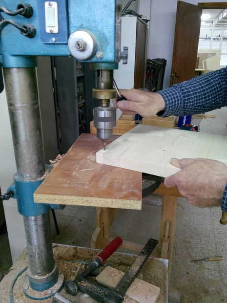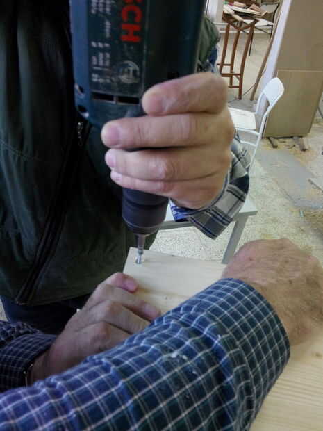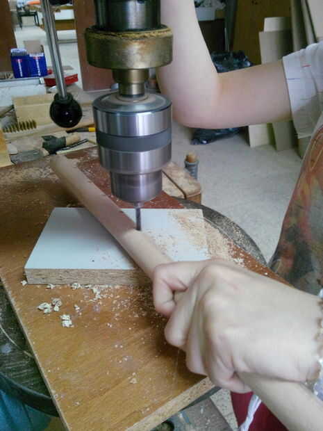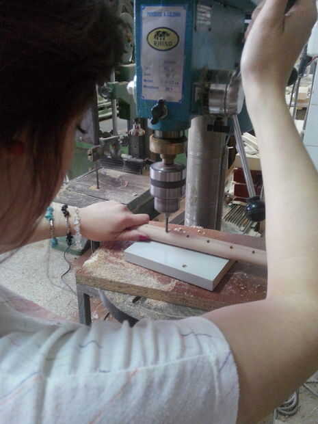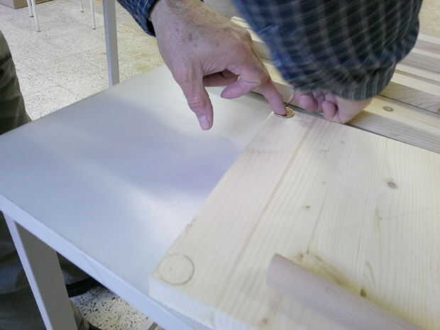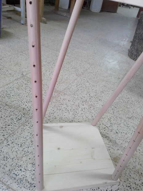 Corte 2 piezas de placas cuadradas con Sierra de cinta (25 x 25). Después de medir 40cm 15 grados y cortar 4 piezas del palo de madera. Para localizar los palillos entre las placas de puntos adecuada marca cerca de las esquinas. Perforar los intervalos de by3.5cm de palos (5m taladro recomendado). Marque el centro de los puntos y alinearlos. Después de utilizar el taladro para localizar los palillos entre estas placas con tornillos.