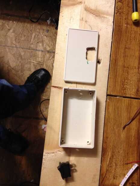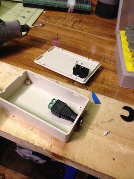 Tomé una caja de proyecto muy barato y cortar tres agujeros. Uno para el interruptor, uno para el enchufe y otro para el cable. Apareció el interruptor oscilante en y caliente pegado un conector que me permite conectar un transformador genérico en el interruptor sin tener que cortar los cables en el transformador. También me permite cambiar más fácilmente hacia fuera la fuente de alimentación. El transformador es una fuente genérica de 12V 1A.