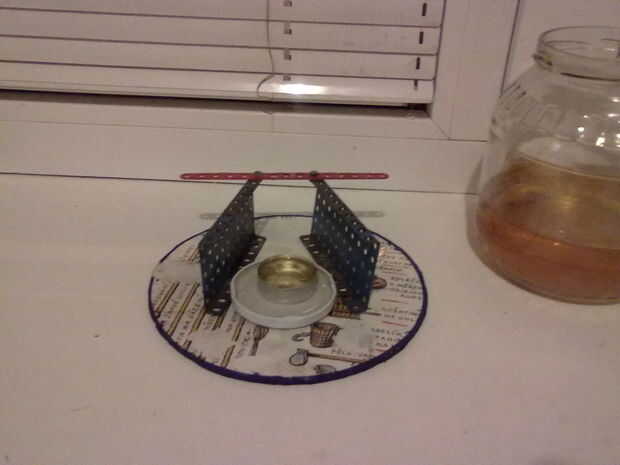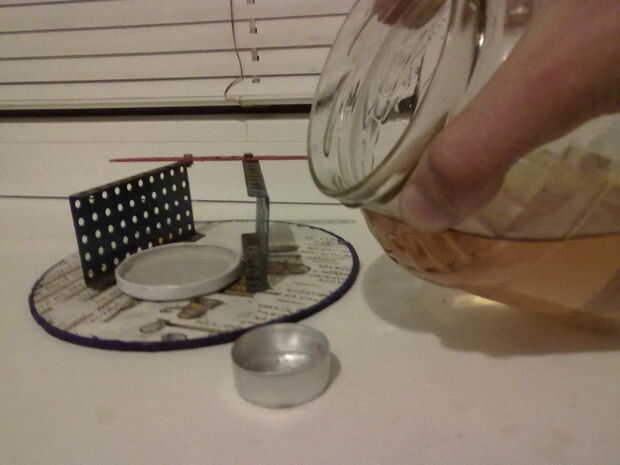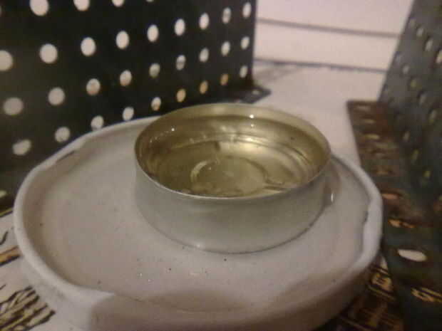Tomar una taza de aluminio de vela quemada y vierta aceite de cocina usado. Este lugar de la taza en una taza de otra llenada de agua.