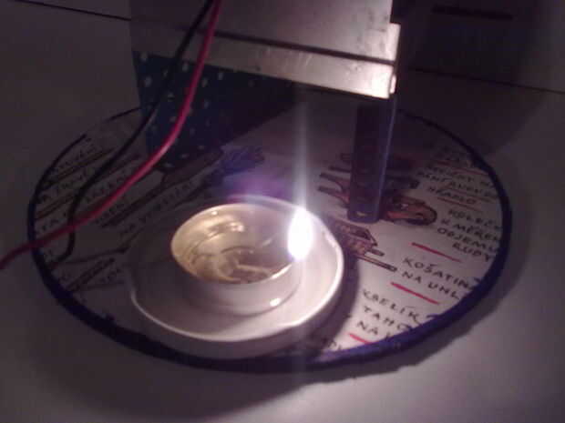 Un generador termoeléctrico, alimentado por una candelita. Comenzó como un experimento de cuanta energía se podía obtener de una vela. Pero me gustó la idea y funcionó muy bien así que construí este ornamento eléctrico-mecánico. No utilizo una temper