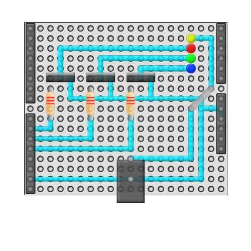 Todos los componentes están en la parte superior del tablero (el lado sin los anillos de soldadura) , las líneas azules son las conexiones en la parte inferior del tablero.