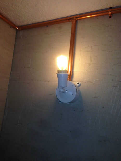 Mi hijastra es a partir de un nuevo restaurante y me pidió ayuda, como de costumbre con proyectos como este que es poco dinero para extras de lujo pero tienen características especiales únicas que muestra que pone en cuidado. Me dieron la tarea del cuarto de baño iluminación inicialmente allí era una luminaria en el centro del techo que no es gran luz dos puestos y una zona de fregadero. No era la tarea más glamorosa pero me dieron rienda y un pequeño presupuesto. Cuando miré primero en la sala el fontanero acababa de terminar y todavía había un par de secciones de tubo de cobre que se inclina contra la pared. Me encantó cómo se veía el color del cobre contra los muros grises de concreto y techo blanco con textura. Otra cosa que hacer es ocultar la costura entre el techo y la pared. Generalmente personas sólo pondría moldeado para cubrirlo pero que es un poco ordinario.