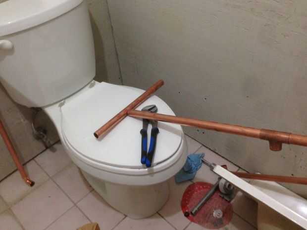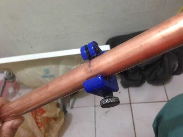 Para hacer que esta iluminación de trabajo que necesitaba tener una banda continua de tubo de cobre alrededor de la habitación donde la pared se une con el techo con 90 grados los codos en las esquinas. Entonces donde se colocaba luces se insertaría una "T" y una pequeña pipa vendría hacia abajo desde el techo a la altura correcta del artefacto de iluminación, también un alimento necesario para ir en el techo al centro donde estaba el viejo aparato suministrar energía. Esto significó un montón de recortes de cobre ya que hay 4 esquinas, 3 Bombillas y una línea de alimentación.