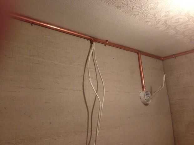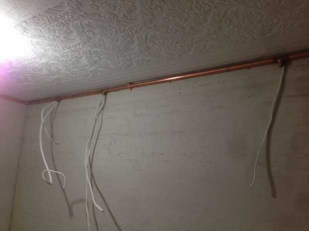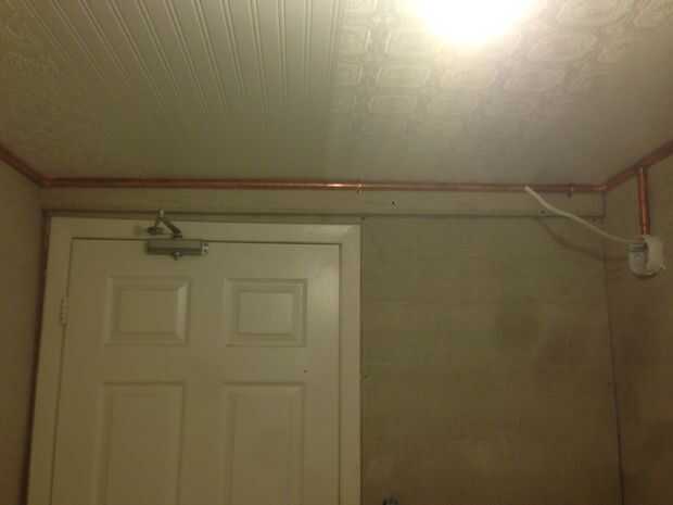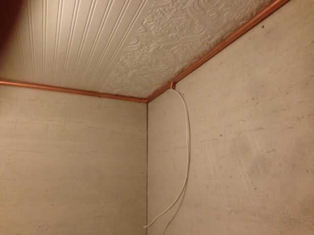 Una vez que todos los tubos fueron cortados corrí el alambre eléctrico revestido a través de los tubos en el suelo. La sección en la parte delantera del cuarto de baño no han alambre en ella así estaba atornillada al techo por lo que hubo un comienzo seguro cuando empezamos a levantar las tuberías cableadas por el resto de las paredes. El cable realmente ligan las articulaciones bien que podríamos recoger un muro en la sección a la vez sin las piezas de mayo cayendo a pedazos. A nos fuimos alrededor de nosotros lo atornillan en su lugar. La última pared fue un poco complicada, teníamos que encajar los tubos de finales. Afortunadamente que anhelamos lo suficientemente que nos podríamos flexión suficiente para entrar al final de la "T" y cuando nos empuja hacia el techo a que todo lo vino colocan tanto como sea posible.