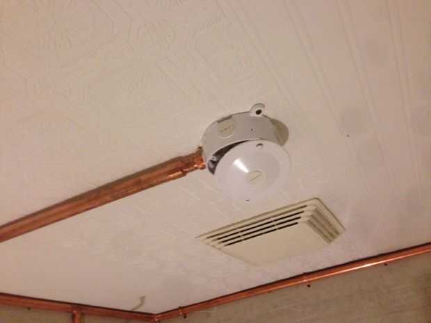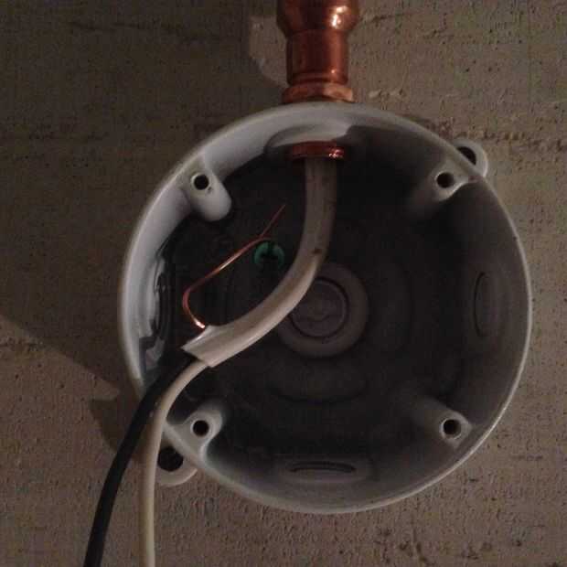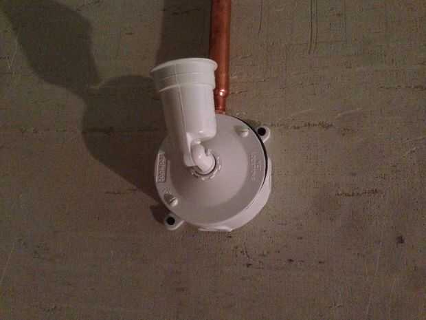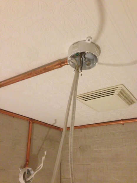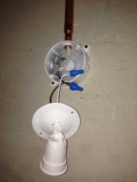 En el extremo de los tubos hacia abajo puse los adaptadores y había atornillada en la caja de accesorio de iluminación. Estos accesorios se hacen para estar al aire libre por lo que será perfecto para un cuarto de baño donde hay humedad presente. Todo lo que necesitaba hacer ahora es conectar los cables, puesta a tierra todo lo necesario y utilizar los sujetadores de alambre de seguridad para unir los cables de colores como.