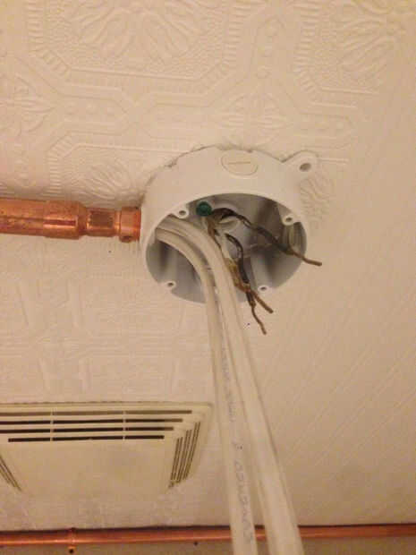 Hice el cuadro de techo de centro donde la energía se suministra última. Mientras que trabajar en cualquier sistema de potencia Asegúrese de apagar el interruptor y prueba para asegurarse de que la energía está apagada antes de hacer nada. Funcionó la antigua potencia cableado a través de la parte inferior de la caja techo, conectado a los cables de iluminación y luego tapa la caja con una tapa. En este punto me aseguré que todas las piezas eran seguras alrededor de la habitación como no quiero mover y frotando el cable dentro de la pipa.