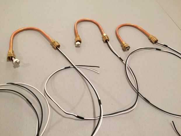 Corte dos pedazos de alambre primario para cada bulbo y de cada color, lo suficiente para alcanzar desde el bulbo a través del tubo en el techo, además de un un pie más o menos, para tener suficiente para trabajar sobre el techo. Para seguimiento de los pares de cables, grabado juntos sobre cada 12".