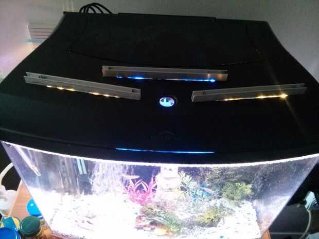 Como se puede ver, hay algunas fugas de luz desde arriba, pero en general no es demasiado malo. Mis peces y las plantas han estado haciendo muy bien. Los disipadores de calor Haz un poco más calientes que quisiera que al 100%, pero su aún menos de su nivel crítico. Si renovarán este podría usar un espacio más grande entre los LEDs, o simplemente comprar un más grande Al canal.