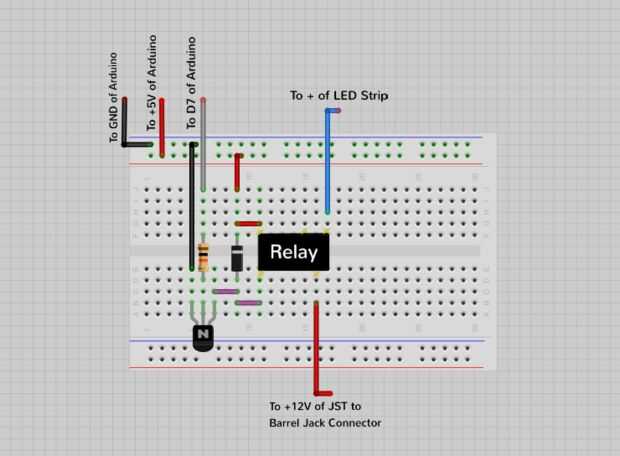 - El GND de la tira del LED va directamente a la - (o negro) de la JST a conector de barril