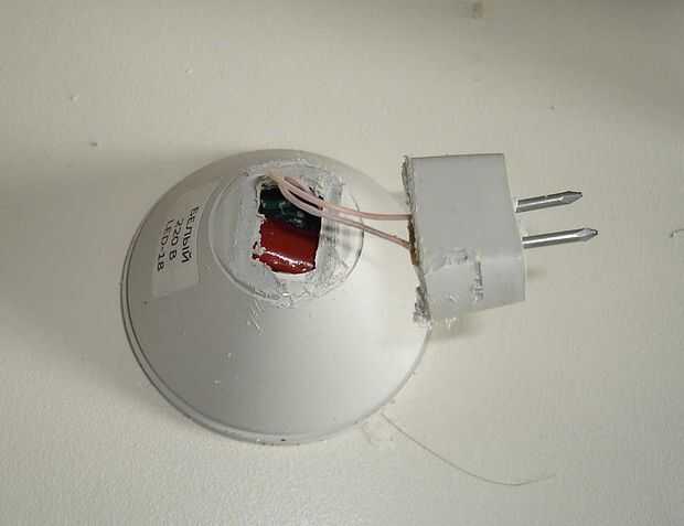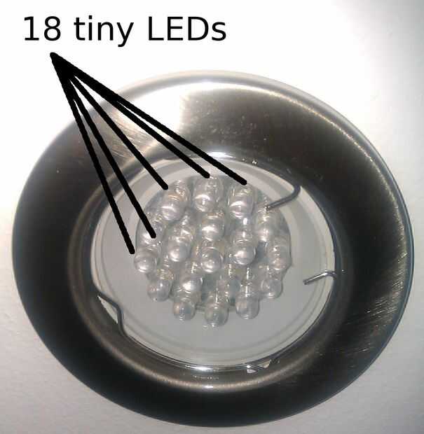 Mi bombilla LED de luz de elección consta de 18 LED pequeños en una matriz hexagonal con un fondo de reflator con una pequeña alimentación individual dentro de cada lámpara. Por lo tanto, utiliza voltaje regular y cada luz reduce 220 Vac a 12 Vdc los diodos necesitan (foto incluida).