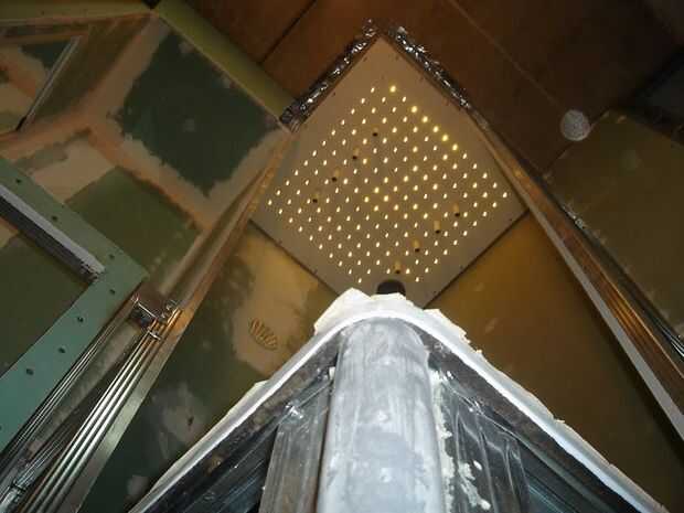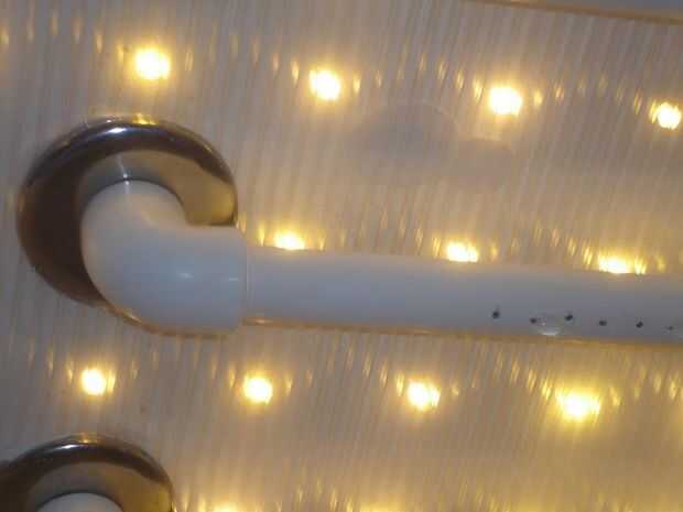 En algunas zonas tenía que utilizar algunas técnicas difíciles como la perforación de agujeros en la pared y colocar una hebra 130 LED de luces de Navidad de IKEA. Tuve que pintar la pieza de panel de yeso antes de taladrar los agujeros e instalar las luces. Luego cubrió con paneles de celular de poli carbonato e instala la cabeza de ducha tropical debajo de ellos.