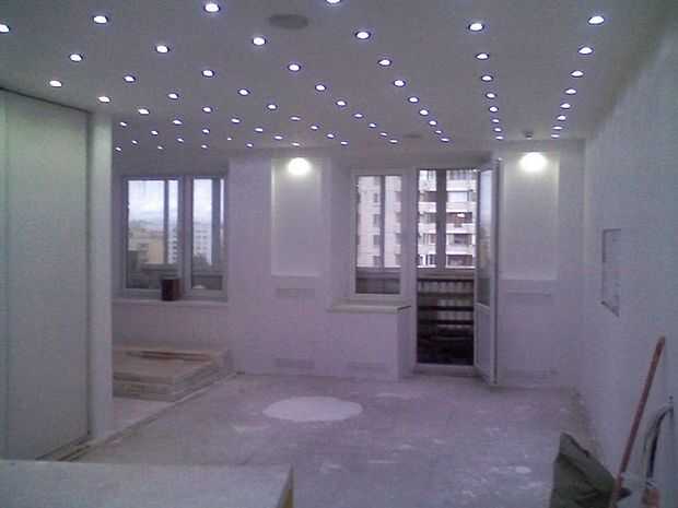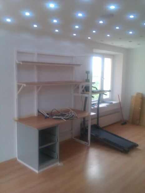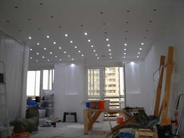 Corrí que la energía luz central más gorda los cables a localidades de rincón de la cocina, el área principal y el baño. Luego los orificios perforados y recorrió los alambres del cable central de cada orificio en zigzag. Cada luz del LED está conectado en paralelo según el código de ciudad/electricidad. Tienen la capacidad y permiso para trabajar con cableado bajo 20 k Wt, pero me llamó el electricista del edificio a inspeccionar mi setup y fije el interruptor de alimentación principal.