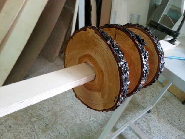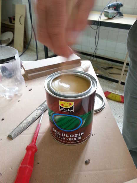 Rodajas de madera están barnizar con el cepillo y después que rodajas de madera se secan. Este proceso se realiza 2 o 3 veces.