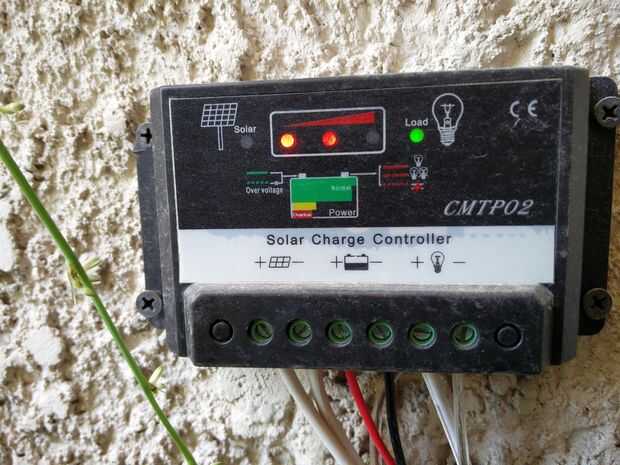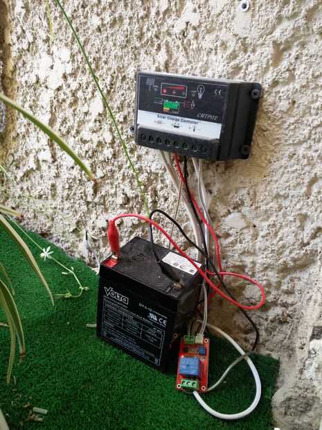 Compré una pequeña parte eléctrica que se siente cuando hay no luz y luego, cerrar un interruptor y transfiere todo el poder reunido desde el panel solar a la batería.- y de la batería el LED.
