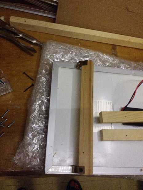 Utiliza dos ángulos de aluminio, unido a la tapa trasera de Panel Solar, que se le atribuye el tablero de madera y de ella dos tablas de madera adicionales
