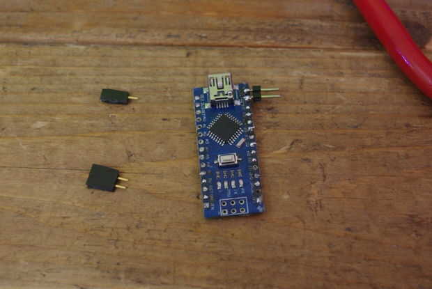 Luego de la soldadura 2 pins hembra encabezado en las clavijas de VIN y GND y otro en el pin de datos 9. Estos 3 son para la tira de LED.