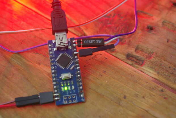 Ahora agarra que Arduino Nano y las patillas de la cabecera. En primer lugar de la soldadura 2 pins macho encabezado en los pines 11 y 12. Estos serán para el botón IO. Necesidad de pulsadores un tirón para arriba resistencia soldadura sin embargo así que esa resistencia de 1K entre datos 11 y GND.