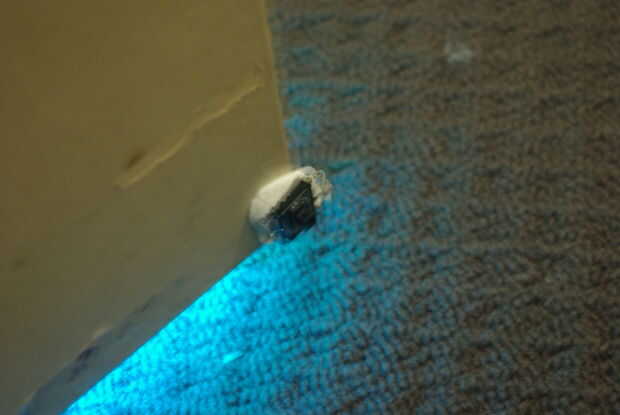 El pulsador, primero conseguir algunos tachuela pegajosa y poner detrás de él y pegarlo sobre la parte delantera de la puerta, alineada de modo que cuando la puerta está cerrada, se presiona el botón. Luego basta con ejecutar que los cables detrás de la misma manera que hiciste con la tira de LED.