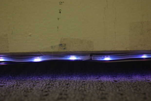 Para sujetar la tira de LED, simplemente uso las tiras de cinta de pegar en la puerta, asegúrese de que estos son lo suficientemente amplia no salen fácilmente. Si la tira del LED tiene una parte posterior pegajosa entonces usted debe ser bueno para ir y no necesita ninguna cinta. Asegúrese que los cables que salen del extremo donde está la bisagra.