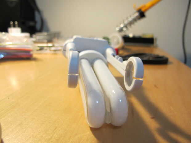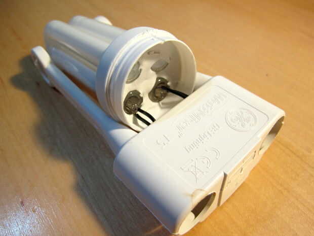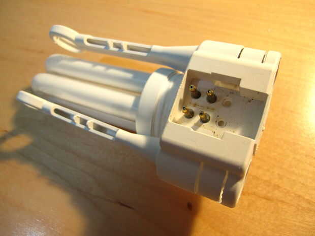 Muchos componentes electrónicos útiles se pueden salvar de quemado Mini tubos fluorescentes. Los componentes se encuentran en la parte inferior del bulbo. El circuito (un convertidor de frecuencia AC) lleva el 50 o 60 ciclos AC de la línea, convertir