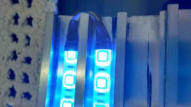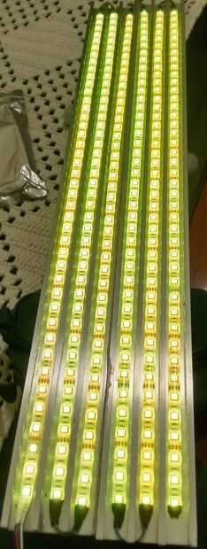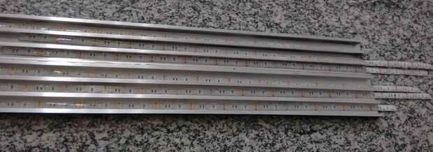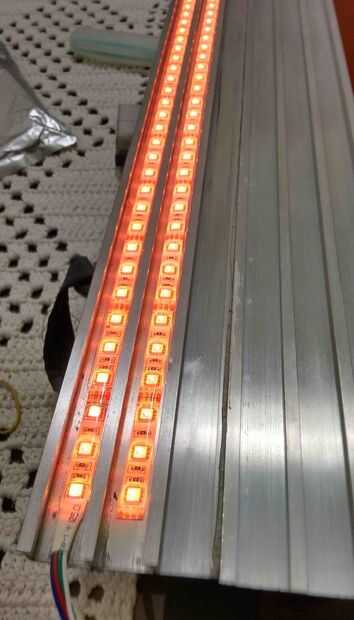 Corte la tira de LED en varios trozos de 75cm en la misma medida de aluminio y pegar dentro. Después de eso se ha hecho la soldadura entre las múltiples piezas de cintas con el alambre de la cinta.