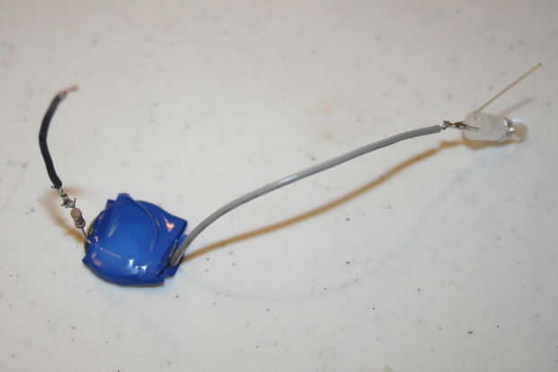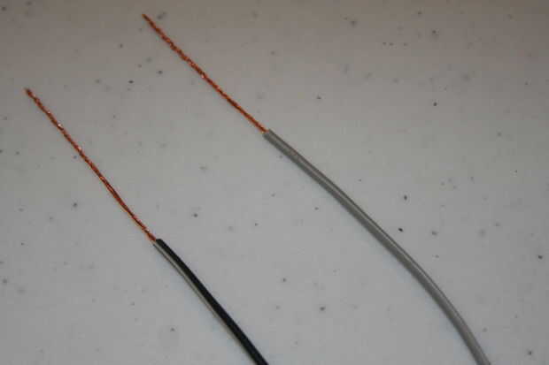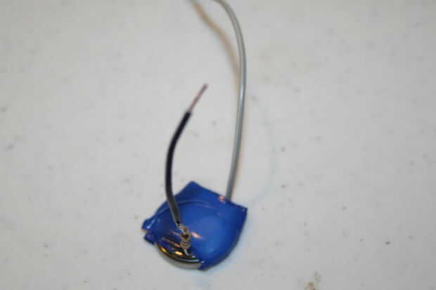 Coloque el cable a la batería de 3 v de la moneda. Con la cinta aislante, cinta los cables en los extremos opuestos de la batería. Tome nota de que el alambre es en el extremo negativo y cual cable es en el extremo positivo. En nuestras fotos tenemos negro como gris como positivos y negativos.