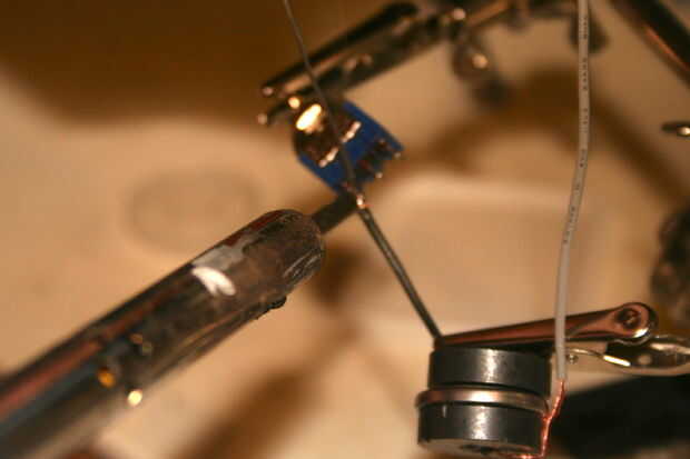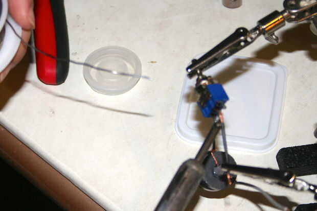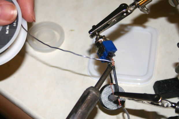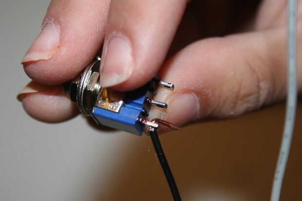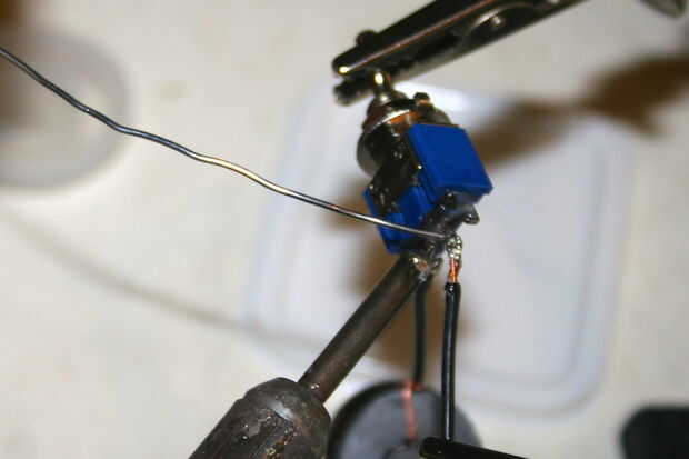 Tomar el alambre extra negativo (el cable negro) y conecta a la pata del centro del interruptor. Soldadura en.