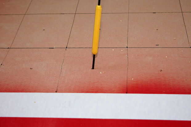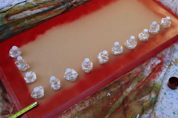 Coloque las botellas trituradas a la base azul aqua como quieras. Hice un 10 filas por arreglo de 4 columnas para darle un aspecto moderno. Medir el largo y ancho y se dividen en 40 cuadrados. Encontrar el centro de cada cuadrado y utilizando una herramienta puntiaguda, perforar un agujero en el centro.