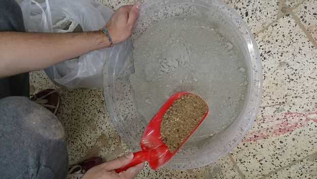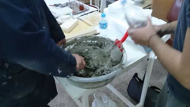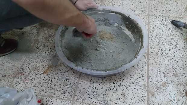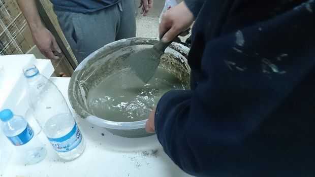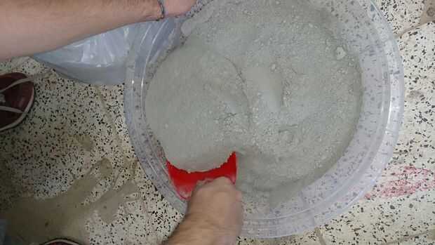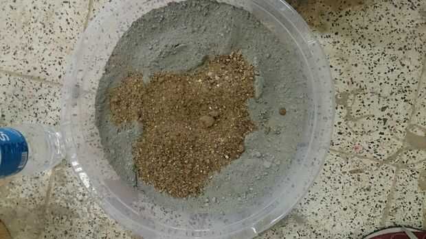 Según el volumen de su tazón de fuente, vierta la cantidad de cemento y arena igual. Mezcla. Después el cemento y la arena está totalmente homogeneizada, debe empezar a verter agua y seguir mezclando hasta que la mezcla llegue a la consistencia correcta. La consistencia correcta es más o menos la misma consistencia como la mayonesa.