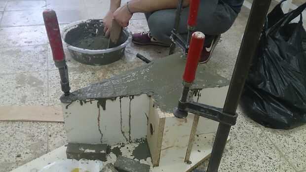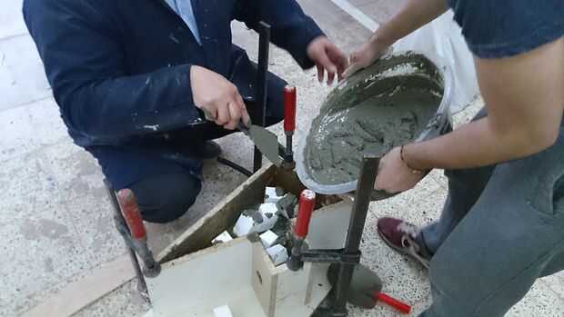 Después de que el molde y la mezcla estén listos, es tiempo de verter. Asegúrese de que frotó el jabón en el molde y creado una capa. Esta es la parte más fácil: simplemente Vierta la mezcla en el molde con una espátula. (Si decides poner cubos de espuma de poliestireno en el bloque de concreto, empezar a colocarlos dentro dedespués de servir por lo menos 30 mm. de mezcla de hormigón. Se deben evitar colocarlos cerca las superficies serán visibles después de quitar el molde.)