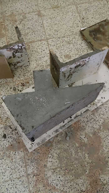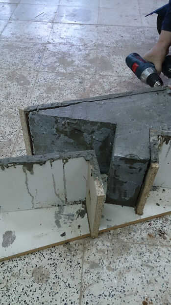 Después de esperar durante 2 días, el bloque se seca en el exterior. Puede quitar el molde utilizando un taladro. Esta es la ventaja si se atornillan las tablas entre sí. Siguiente paso es esperar 5 días más, se pueden observar el cambio y la diferencia del color a través de los días. Solo no olvides verter agua dos veces al día. 5 días después verter el agua no es necesario y puede comenzar a utilizar la iluminación entonces.