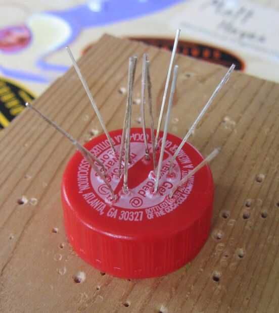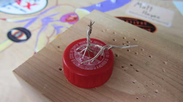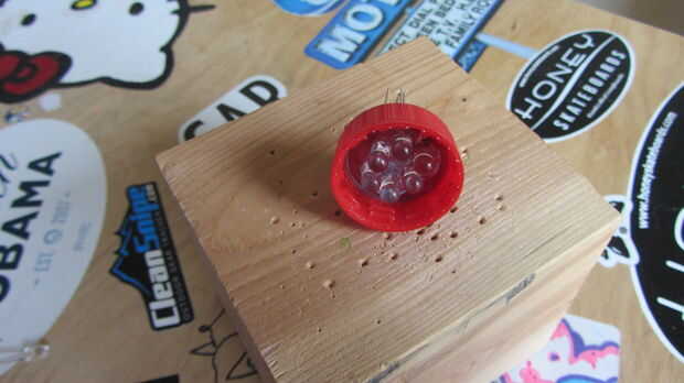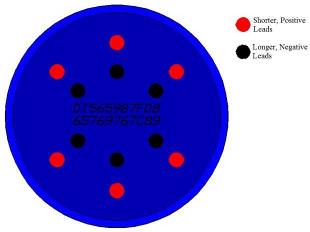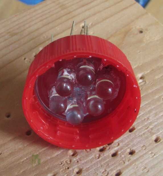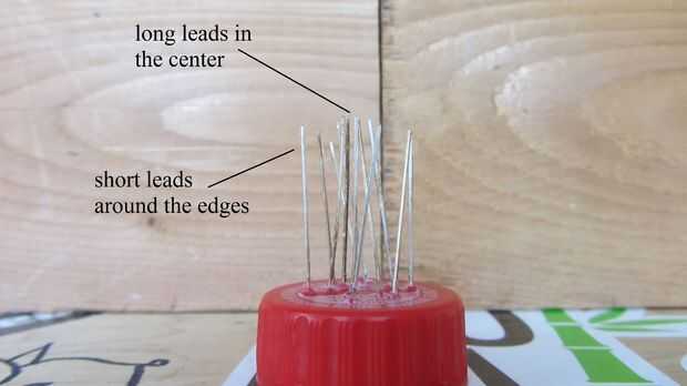 Conecte los cables de los LEDs en los agujeros según el diagrama. Asegúrese de que todos los cables (negativos) más se insertan en los agujeros más cercanos al centro de la tapa. Los cables (positivos) más cortos se deben insertar en los agujeros correspondientes más cercanas a los bordes de la tapa.