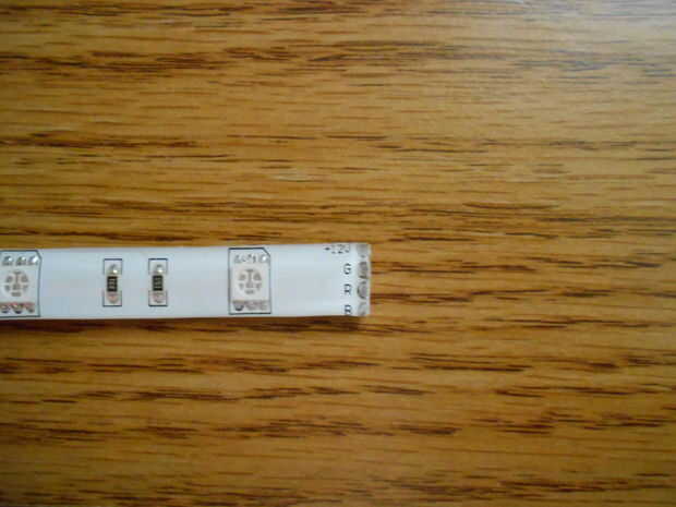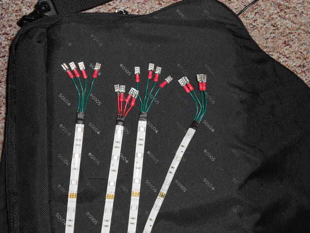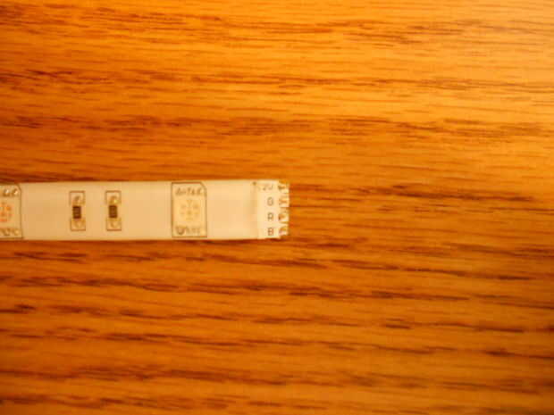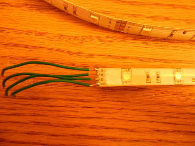 Tenemos que soldar 4 cables a cada tira de LED que tenemos. Las tiras de LED que ordené de sparkfun tienen una cubierta protectora transparente que permite su uso bajo el agua. Simplemente use un cuchillo y hacer la goma (que encontré fue fácil pelar apagado una vez que hice una pequeña rodaja). Encontré lo más fácil para poner un poco de su propia de la soldadura en los stirps primero antes de jugar incluso con los cables, la cantidad de soldadura en las conexiones no será suficiente. Con soldadura más en cada conexión luego soldar los cables a mis grupos de soldadura.