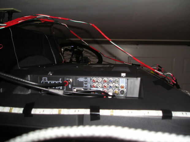 Aquí son unos ejemplos de mi temporal set up (voy a volver con fotos finales más adelante).  Sólo usé algunos cinta aislante por ahora hasta que algún tiempo adicional.  Calculo de todos TV es un poco diferente y hay ninguna manera definitiva sobre la manera de hacerlo esto hacer alguna medición y bofetada las tiras de LED a su televisor mejor que puedas:).  Si usas cinta aislante sólo asegúrese de no cinta sobre un LED:).
