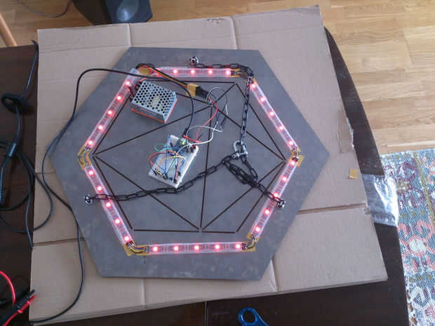 Ahora juntar todas las cosas en la hoja de metal con la cinta adhesiva, perfore un gancho en el techo, colgar la hoja y conecte la fuente de alimentación. Ahora a lightswitch un ver lo que sucede.