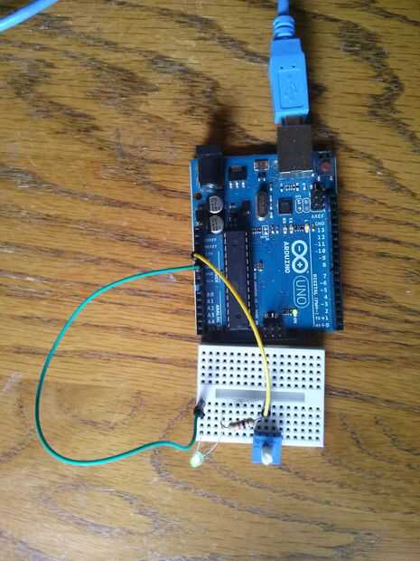 Crédito extra: adjuntar otro LED a la patilla no utilizada de la olla a través de un resistor de 1 K, entonces el otro extremo de ese LED a tierra. Al girar la perilla, un LED conseguirá más brillante mientras que el otro es más tenue.