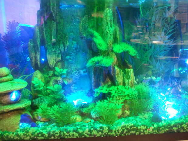 Cuando digo "dentro de su pecera", me refiero a eso. Sistemas de iluminación más que he encontrado en línea para acuarios implican iluminación desde fuera de la pecera. Esta pecera tiene luz coincidiendo pacíficamente dentro del tanque con sus ocupantes.