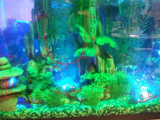 Pongo una sección de 1' de la luz de tira del RGB impermeable en la parte inferior de la tapa del tanque de pescados y una sección de 2' detrás de la cascada. Estas dos tiras se conectan hacia el segundo controlador de color analógico.