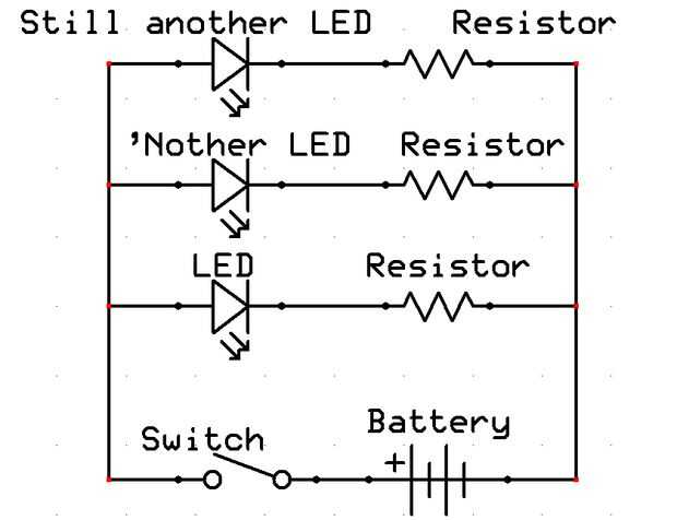 Este paso es para aquellos que quieren trabajar con las partes desnudas. Puede hojear la mayor parte de esto si has comprado la casa prefabricada que del paso anterior. Aquí estoy suponiendo que ya sabes soldar. Primero tendrá que decidir qué resistencia se necesita para los LEDs. Esto dependerá del voltaje de su batería y en menor medida, el tipo de LED. Una buena regla del pulgar, si no te gusta hacer matemáticas, es 100 Ohms (marrón-negro-marrón) de 3 voltios, 470 ohmios (amarillo-violeta-marrón) para 6 voltios y 1.000 Ohms (marrón-negro-rojo) de 9 o 12 voltios. Estos son valores muy conservadores. Si usted quiere más detalles, y entiendes las unidades, utilice la calculadora de LED aquí.